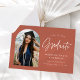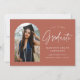 Anúncio de graduação da Tendy com a foto do formando moldada por um arco de cor argila com "Formando" em um roteiro manuscrito branco. Personalize a frente do cartão de anúncio de graduação em março adicionando o nome do formando, o ano de graduação, o nome da escola e os planos futuros. O anúncio de graduação de fotos é revertido para exibir um padrão pontilhado vermelho e branco. O anúncio é adequado para formandos de segundo grau e de faculdade.