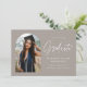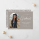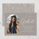 Anúncio de graduação da Tendy com a foto do formando enquadrada por um arco verde com "Formando" em um roteiro manuscrito branco. Personalize a frente do cartão de anúncio de graduação em março adicionando o nome do formando, o ano de graduação, o nome da escola e os planos futuros. O anúncio de graduação de fotos é revertido para exibir um padrão pontilhado em cinza/bege e branco. O anúncio é adequado para formandos de segundo grau e de faculdade.