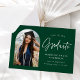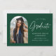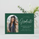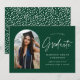 Anúncio de graduação da Tendy com a foto do formando enquadrada por um arco verde com "Formando" em um roteiro manuscrito branco. Personalize a frente do cartão de anúncio de graduação em março adicionando o nome do formando, o ano de graduação, o nome da escola e os planos futuros. O anúncio de graduação de fotos é revertido para exibir um padrão pontilhado verde e branco. O anúncio é adequado para formandos de segundo grau e de faculdade.