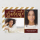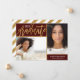 Cartões de anúncio de graduação impressos personalizados para barato personalizados com suas fotos e texto. Este elegante design moderno apresenta uma fonte moderna com um falso efeito de folha de ouro. Adicione 2 fotos de mais velho juntamente com o ano de formando, o nome e os detalhes escolares ou qualquer outro texto personalizado. Use as ferramentas de design para escolher qualquer cor de fundo, adicionar mais fotos ou editar as fontes de texto e as cores. O verso tem um padrão de tiras de folhas douradas ou usa o espaço para textos e imagens adicionais. Esta design de chic é perfeita para formandos do ensino médio, segundos graus ou faculdade!