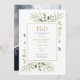 Apresentando delicadas folhas de cor aquosa verde, este cartão de anúncio de graduação de Phd chic pode ser personalizado com sua foto de formando no verso. Projetado por Thisnotme©