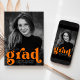 Anúncios de graduação em na moda que apresentam a foto vertical do formando com "formando" em letras laranja em negrito. Personalize o anúncio de graduação de fotos adicionando o nome do formando, o ano de graduação e a escola. O anúncio é revertido para exibir um padrão retrorrático laranja e branco.