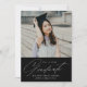 Anúncio simples de graduação com a foto do formando no topo com o "Formando" exibido em um roteiro branco de caligrafia moderna, abaixo, sobre fundo preto. Personalize a frente do anúncio de graduação de fotos adicionando o ano de graduação, o nome do formando e o nome da escola. A placa reverte para exibir um padrão de faixa diagonal preto e branco. O anúncio da graduação de 2023 é perfeito para formandos de segundo grau e de faculdade.