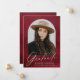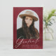 Anúncio de graduação elegante apresentando o dentro de foto do formando de um quadro de arco com um fundo de cor d'água burgundy. "Formando" é exibido em um roteiro branco moderno de caligrafia com o nome do formando, a escola e o ano de formando mostrado abaixo. O anúncio de graduação de fotos reverte para exibir um plano de fundo de cor d'água com burgundy correspondente com espaço para texto e fotos adicionais.