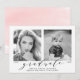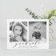 Nossos anúncios de fotos de graduação "Agora e Depois" na na moda mostram a foto favorita do seu mais velho (agora) assim como uma foto de bebê ou criança (então). Alterar os anos abaixo de cada foto para refletir o ano de graduação e o ano de nascimento (ou a foto do ano foi tirada). Os modernos anúncios de graduação exibem "formando" em uma letra elegante com o nome do formando, o nome da escola e o ano de classe abaixo. O verso do anúncio do formando apresenta um plano de fundo de cor-de-água rosa e pincel suave. Adicione uma foto ou texto ao fundo para obter um design mais personalizado!