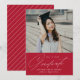 Anúncio simples de graduação com a foto do formando no topo com o "Formando" exibido em um roteiro branco de caligrafia moderna, abaixo, sobre um fundo vermelho. Personalize a frente do anúncio de graduação de fotos adicionando o ano de graduação, o nome do formando e o nome da escola. A placa reverte para exibir um padrão de faixa diagonal vermelha e branca. O anúncio de formatura vermelha é perfeito para formandos segundos graus e universitários.