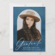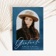 Anúncio de graduação elegante com o dentro de foto do formando de um quadro de arco com fundo de aquarela azul-marinho. "Formando" é exibido em um roteiro branco moderno de caligrafia com o nome do formando, a escola e o ano de formando mostrado abaixo. O anúncio de graduação de fotos reverte para exibir um plano de fundo de aquarela de marinho correspondente com espaço para texto e fotos adicionais.