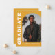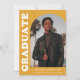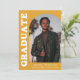 Anúncio de graduação de na moda e tendência apresentando a foto do formando na frente com um quadro de fotos de arco de offset. O "Formando" é apresentado em caracteres brancos retrorreflectores a negrito num fundo amarelo-alaranjado. Personalize a frente do anúncio de graduação em fotos de arco adicionando o nome do formando, a escola e o ano de graduação. O cartão se reverte para exibir 3 fotos adicionais com espaço para texto personalizado, como futuros planos de faculdade, planos de carreira, detalhes de festa de formatura, etc. O anúncio de graduação em laranja-amarelo é perfeito para formandos de segundo grau e de faculdade.