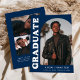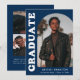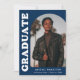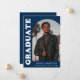 Anúncio de graduação de na moda e tendência apresentando a foto do formando na frente com um quadro de fotos de arco de offset. "Formando" é apresentado em letras maiúsculas e brancas em negrito com a letra de fundo azul marinho. Personalize a frente do anúncio de graduação em fotos de arco adicionando o nome do formando, a escola e o ano de graduação. O cartão se reverte para exibir 3 fotos adicionais com espaço para texto personalizado, como futuros planos de faculdade, planos de carreira, detalhes de festa de formatura, etc. O anúncio da graduação em azul-marinho é perfeito para formandos segundos graus e universitários.