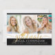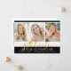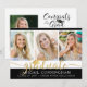 Anúncio moderno de graduação de colagem de fotos com 3 fotos na frente e 1 na parte traseira com a tipografia moderna de script de caligrafia metálica em ouro para o título FORMANDO acentuado com um boné de formatura de ouro e personalizado com seu nome de formando, ano de aula e segundo grau ou nome de universidade contra uma cor preta editável (escolha uma cor de escola ou uma cor complementar para suas fotos). O verso inclui detalhes sobre o seu formando. ASSISTÊNCIA: Para obter ajuda com a modificação/personalização do design, transferindo o design para outro produto ou, se você quiser coordenar itens, entre em contato com o designer ANTES DE PEDIR por meio do Zazzle Chat ou makeitaboutyoustore@gmail.com.