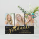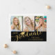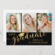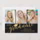 Anúncio moderno de graduação de colagem de fotos com 3 fotos na frente e 1 na parte traseira com tipografia de script de caligrafia em ouro metálico para o FORMANDO de título acentuado com um boné de formatura ou placa-mãe e personalizado com seu nome de formando e ano de classe contra um plano de fundo preto editável — selecione uma cor diferente ou escolha de uma variedade de planos gráficos estilizados. O verso inclui detalhes sobre o seu formando. ASSISTÊNCIA: Para obter ajuda com a modificação/personalização do design, transferindo o design para outro produto ou, se você quiser coordenar itens, entre em contato com o designer ANTES DE PEDIR por meio do Zazzle Chat ou makeitaboutyoustore@gmail.com.