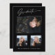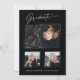 Três cartões de anúncio de fotografia, tendências, modernos e elegantes, com design de elementos do texto moderno com roteiro de tinta de caligrafia. As fotos do formando na frente da placa são realçadas com uma delicada e minimalista placa de gradiente. A parte traseira do cartão oferece espaços de texto personalizados para informações sobre a sua graduação ou pode ser apagada se você quiser enviar uma mensagem. Preto e branco ou personalize facilmente o fundo para corresponder à cor primária da sua escola ou a qualquer cor da sua escolha. Perfeito para segundos graus, universitários e formandos universitários.