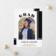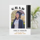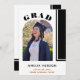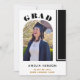 Anúncio de Graduação de Foto do Formando Branco Negro Moderno. Design moderno com o nome do formando e uma foto em um quadro de arco na frente. Personalize o texto e a foto na frente e o anúncio na parte traseira.