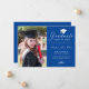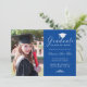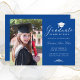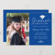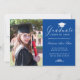 Envie a sua família e amigos um cartão personalizado único de graduação de fotos, com sua foto personalizada à esquerda e à direita, um boné branco com a palavra "Formando", classe/ano, nome e outros detalhes da cerimônia na caligrafia formal do roteiro branco para personalizar sobre um fundo azul real. Desenhada por Susan Coffey.