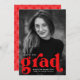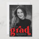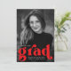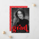 Anúncios de graduação em na moda que apresentam a foto vertical do formando com "formando" em letras vermelho em negrito. Personalize o anúncio de graduação de fotos adicionando o nome do formando, o ano de graduação e a escola. O anúncio é revertido para exibir um padrão de arco retrô vermelho e branco.