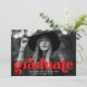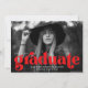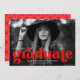Anúncios de graduação em na moda que apresentam a foto horizontal do formando com "formando" em letras vermelho em negrito. Personalize o anúncio de graduação de fotos adicionando o nome do formando, o ano de graduação e a escola. O anúncio é revertido para exibir um padrão de arco retrô vermelho e branco.