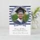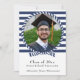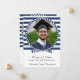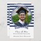 Um anúncio de graduação de listras brancas azuis com Marinho de fotografia náutica moderno, apresentando um quadro sobre sua escolha de foto. A parte traseira apresenta outra foto e mais detalhes sobre seu formando.