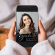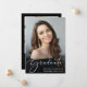 Anuncie suas conquistas de formando com este anúncio de graduação em preto-na moda. "Formando" escreveu um roteiro branco elegante sobre sua foto. Por baixo, adicione seu nome, escola e ano de aula. No verso, adicione uma fotografia adicional e sua mensagem personalizada.