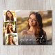 Cartão plano com anúncio de formatura elegante, com a foto do formando sobreposta com uma faixa de três fotos quadradas menores e "formando" em uma fina escrita branca moderna e seu nome e ano de aula em uma tipografia branca simples.