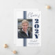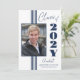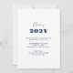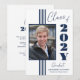Anúncio de graduação elegante da na moda de 2025 com faixas azuis de marinho, quadro fotográfico e texto em fundo branco.