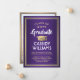 Compartilhe a alegria de um segundo grau ou formandos com estes anúncios personalizados de roxo, ouro e branco de fotos. (DICA DE IMAGEM: Uma maneira fácil de centralizar uma imagem exatamente como você deseja é recortá-la antes de carregá-la no site do Zazzle.) Este modelo inclui o nome do formando, o ano de aula e a escola, assim como qualquer texto de sua escolha, como detalhes do convite de festas, honras especiais, título do grau, citação de inspiração favorita, informações de contato do formando, planos educacionais futuros ou nova posição de emprego. Todo texto é simples de personalizar. Design apresenta um fundo ombre roxo moderno, limite de folha de ouro falso e boné de conselho morteiro, caligrafia elegante de script, tipografia tradicional e uma foto de sua escolha, como uma foto de mais velho ou imagem da cerimônia de início. Observe que o ouro é impresso a cor, não a folha metálica. Estes cartões de anúncio de graduação são uma maneira moderna e chique de compartilhar sua celebração especial com a família e os amigos. Parabéns ao formando!
