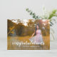 Anúncio moderno de graduação de meninas com "parabéns para nosso formando" junto com uma linha de solteiro de texto para detalhes de graduação sobre sua foto horizontal de sangria de cheio favorita. "Parabéns" está em uma letra branca elegante e a parte de trás tem uma colagem com três fotos junto com sua mensagem pessoal. Um design simples que faz da sua foto o recurso principal.