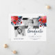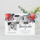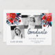 Cartão Elegante de graduação floral de aquarela apresentando vibrantes rosas vermelhos de peônia buquês com folhagem e penas, e um script de caligrafia de marinho chic sobre um fundo branco claro (cor variável).++++++ Fácil de personalizar em ambos os lados com suas 3 fotos, nome do formando, escola, classe e seu texto.
