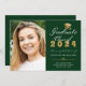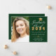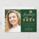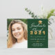 Anuncie sua formatura em estilo com este elegante cartão de anúncio personalizado de fotos. Este design tem sua foto à esquerda e à direita um design de tipografia com as palavras Classe de Formando de 2024 com seu nome, escola e data para personalizar em ouro e roteiro branco, acentuado por um falso boné de ouro sobre fundo verde. A parte de trás do cartão está verde. Desenhada por Susan Coffey.