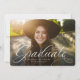 Um formando clássico e elegante em branco fica no fundo de uma foto horizontal. O texto personalizado inclui espaço para o nome do formando e também detalhes escolares e do ano. O backer da cinza de carvão negro tem um padrão de grade simples, e a cor pode ser alterada clicando em "personalizar ainda mais". Anuncie a realização do seu formando aos amigos e à família com este design!