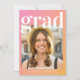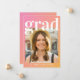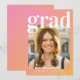 Cartão de anúncio de graduação cor-de-rosa e laranja, com uma fotografia do formando, "formando" em uma fonte branca grande e negrito e seu nome, escola e ano de aula em uma simples tipografia branca moderna.
