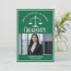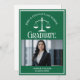 Este cartão de anúncio de graduação da escola de direito verde personalizado apresenta tipografia branca para uma classe de formando 2024 acima da sua foto de estudante. Personalize com o seu ano de graduação sob as escalas de justiça e fotografia para um advogado personalizado ou cartão de advogado excelente.