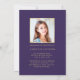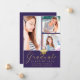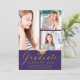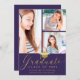 Este cartão de anúncio de graduação moderno com a coleção personalizada de 4 fotos será a escolha perfeita para enviar para a sua família e amigos. A frente do cartão tem três fotos para você mudar para seu próprio bordado em roxo. Abaixo do moderno faux gold script, lê-se "Formando" com ano de aula, nome e escola para personalizar. A parte de trás da placa tem uma quarta foto com mais detalhes sobre sua graduação e planos futuros para personalizar. Parabéns pela sua formatura! Desenhada por Susan Coffey.