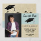 Cartão de Anúncio de Save the Date de Formatura Azul Moderno e Rústico com Foto. Cartão moderno de save the date para anunciar a festa de formatura do seu graduado. O cartão é em textura rústica azul e bege e inclui um chapéu de formatura. O design tem texto moderno - personalize todo o texto no cartão com seus dados, e um modelo de foto - insira a foto do graduado no modelo. Altere a data e outros textos no verso do cartão.
