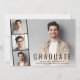 Cartão plano com anúncio de graduação moderno mínimo, apresentando a foto do formando sobreposta com uma faixa de três fotos quadradas menores e "Formando", seu nome, escola e ano de aula em uma simples tipografia.