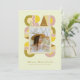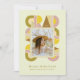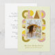 Retro-style, yet modern, graduation invitation photo card that features the word "GRAD" designed with geometric shapes in various colors that form a border around the photo of the graduate. Retro colors—yellow, pink, brown, and green—add to the card's retro style.