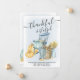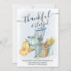 Cartão de anúncio de gravidez de queda que você pode personalizar com sua mensagem e data de vencimento do bebê. Graças e abençoado está escrito em um elegante roteiro manuscrito e a cena rústica da varanda com aquarela tem uma cadeira de balanço, cesto de toros, jarro de trigo e colheita de abóboras-do-campo. Ele tem um fundo azul pálido de lavagem e uma cadeira azul de balanço - perfeito se um bebê nascer.