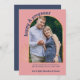 Anúncio personalizado de fotogravidez na paleta colorida de cor verde e azul-marinho. O modelo de foto está configurado para você adicionar sua própria foto, que é emoldurada em um arco dourado com folhagem fina. "feliz e grávida" é escrito em tipografia ousada e arcaica. O restante do texto é totalmente editável para você personalizar com sua mensagem personalizada, data de vencimento do bebê e seu próprio nome. Uma design moderna e chique para compartilhar uma foto de sua gravidez.