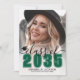 Classic Modern Graduation Announcement. The front features a full-page photo with a white gradient at the bottom that fades seamlessly into the image. Over the gradient, "2026" appears in a bold emerald green or forest green classic school-style font. Just above it, "Class of" is written in elegant black script. To the left of the year is a small, customizable graduation cap icon. Below the year, the graduate's name and school name are prominently displayed. All colors can be customized to match school colors or personal preferences.