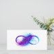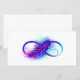 Símbolo infinito com uma bela pena pintada em cores roxas e azuis brilhantes sobre fundo branco.