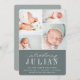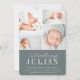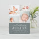 Os anúncios de nascimento elegantes apresentam quatro fotos recém-nascidas dispostas em um layout de colagem em uma faixa escura verde. "Apresentando [name]" aparece abaixo no script de caligrafia e no texto clássico do bloco. Personalize com o nome do cheio do bebê, estatísticas de natalidade e uma assinatura familiar no fundo. Uma design simples e limpa, neutra em termos de gênero, para anunciar a sua chegada.