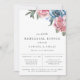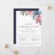 Disposição floral de aquarelas em tons de massa, azul-marinho e verde, convite para janto de ensaio. Design de fotografia e tipografia moderna. A parte traseira da placa apresenta cor azul sólida do marinho.