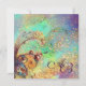 Caprichosos, elegantes, redemoinhos artísticos e pós de fada fantásticos em cores azul-teal, azul-aqua, verde, amarelo e brilhos dourados. Detalhe de pintura tríptica, técnica mista com folha de ouro e prata, 2009. O tema aborda arquétipos e simbolismo alquímico medieval. Esta é uma visão destilada do imaginário coletivo ocidental e oriental que busca imagens remotas nas profundezas do misterioso jardim das sombras perdidas.