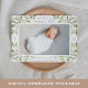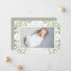 O anúncio de nascimento botânico elegante, em tons chic de verde, apresenta uma foto horizontal ou paisagística de cheio sangrando com solteiro de folhas de cor verde-clara delicada e bagas brancas nos cantos. Personalize com o nome do bebê, estatísticas de natalidade e uma mensagem pessoal, e adicione três fotos quadradas adicionais às costas.