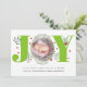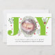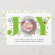 Verde limão Joy com bagas Primeira foto de Natal Anúncio de nascimento de bebê Feriado. Mostra a palavra "JOY" com bagas vermelhas e verde enquanto em vez da letra "O" está a sua foto. O verso inclui bolinhas verdes.
