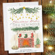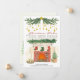Cartões de anúncio personalizados em movimento. "O Natal Deseja de Nossa Nova Casa" é enquadrado com uma pinheira, pingando com ornamentos de ouro e uma lareira acolhedora com meias de Natal, velas, uma minisárvore de natal cercada e um pequeno pacote. O modelo está configurado para que você adicione seus nomes e seu novo endereço. A parte de trás do cartão tem uma simples cena florestal com árvores de abeto e neve.