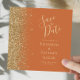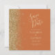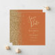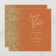 A borda esquerda deste elegante casamento moderno salve o cartão de data apresenta uma borda falsa dourada. O texto personalizável combina manuscrito pálido de cor dourada, fontes copperplate e itálico em um fundo laranja queimado. O verso apresenta uma design de cor laranja queimada e ouro correspondente.
