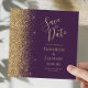 A borda esquerda deste elegante casamento moderno salve o cartão de data apresenta uma borda falsa dourada. O texto personalizável combina manuscrito dourado, fontes em copperplate e itálico em um fundo roxo escuro. O verso apresenta um design de roxo e ouro correspondentes.
