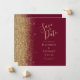 A borda esquerda deste elegante casamento moderno salve o cartão de data apresenta uma borda falsa dourada. O texto personalizável combina manuscrito pálido e dourado, fontes copperplate e itálico em um fundo vermelho burgundy. O lado inverso apresenta um burgundy e um design de ouro correspondentes.