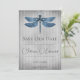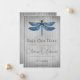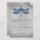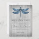 Personalize um anúncio de casamento único com uma Libélula Joias Salvar a Data. O design do anúncio apresenta uma vibrante libélula enfeitada com joias contra um fundo listrado vintage desgastado. Anúncio adicional de salvar a data disponível para este design em uma variedade de cores.