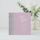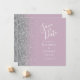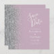 A borda esquerda deste elegante casamento moderno salve o cartão de data apresenta uma borda cintilante. O texto personalizável combina a escrita manual de cinzas prateadas, fontes copperplate e itálico em um fundo lilático empoeirado. O verso apresenta um design de lilás e prata correspondentes.